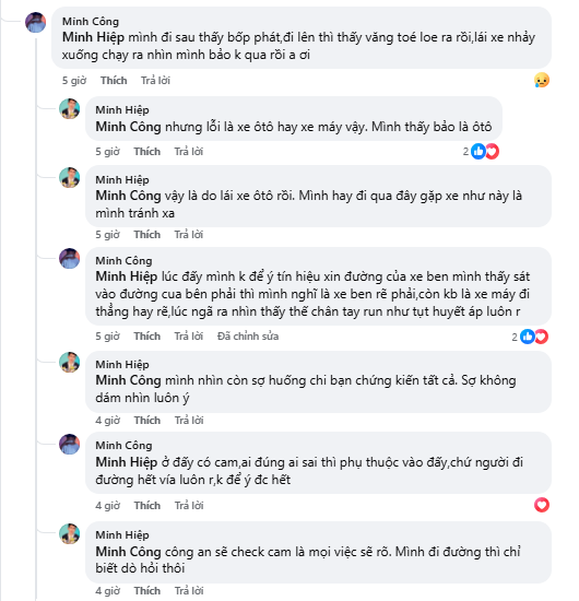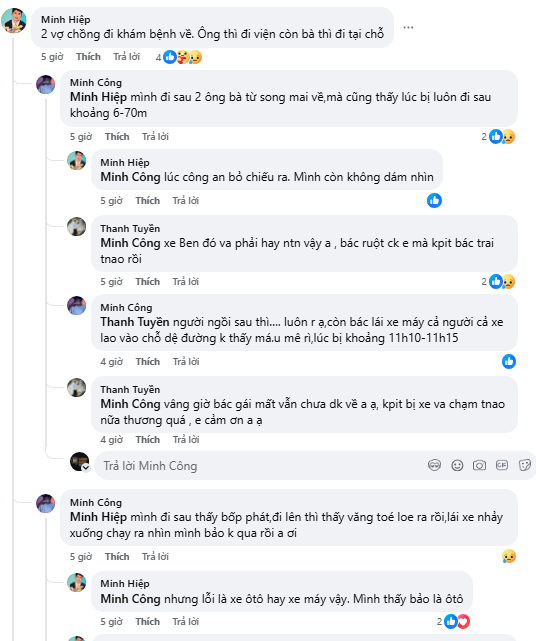 Cú va chạm mạnh khiến cả hai vợ chồng ngã xuống đường. Người chồng bị thương nặng và nhanh chóng được người dân đưa đi cấp cứu tại bệnh viện. Riêng người vợ không may bị bánh xe ben cán qua, tử vong tại chỗ. Theo những người chứng kiến, hiện trường khiến nhiều người ám ảnh.