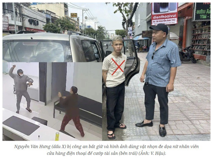 Nguyễn Văn Hưng (dấu X) bị công an bắt giữ và hình ảnh dùng vật nhọn đe dọa nữ nhân viên cửa hàng điện thoại để cướp tài sản (bên trái). (Ảnh: V. Hậu)
